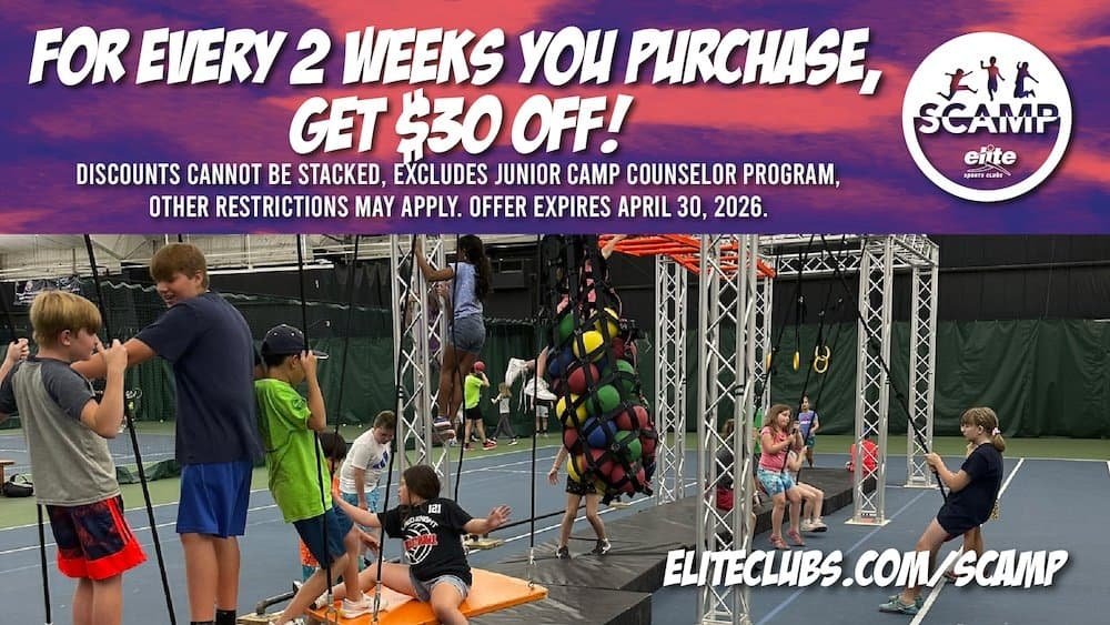 Packages purchased after June 1st will be subject to a $10 late fee. Packages expire on August 22, 2026. No refunds or credits will be issued for unused packages. Children enrolled in summer tennis lessons can attend any class at any Elite Sports Club location. Advanced sign-up through the Member App is required for each class; no drop-ins are allowed.